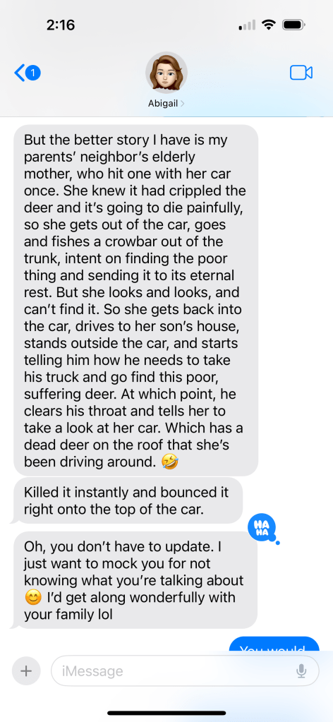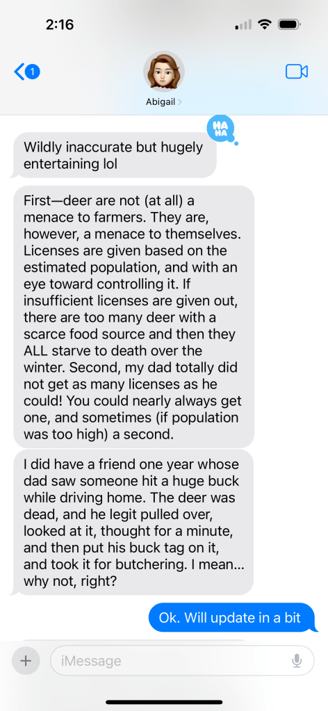 I shared my hunting story with my friend Abby who is referenced in it. I wrote the conversation as best as I remembered it, though what I recalled most was how her father didn’t do stand or still hunting, just drove around in his truck till he saw a deer. We then had the following text conversation. (I’m pretty sure I conflated him with a local farmer I’ve talked to in Massachusetts.)