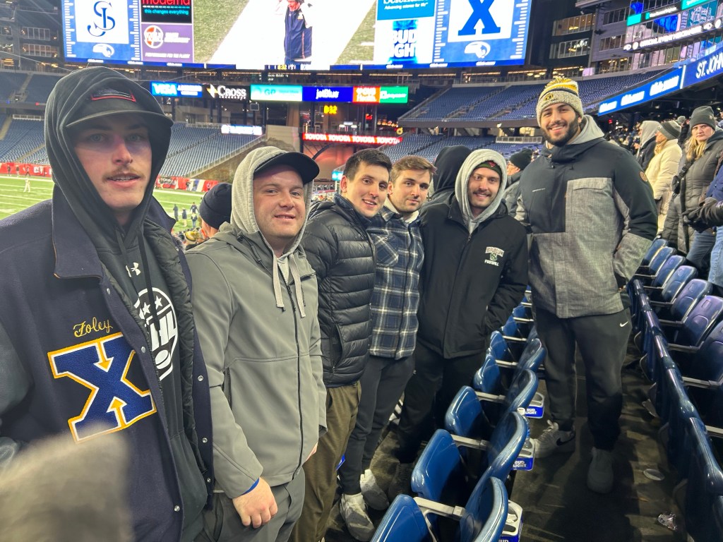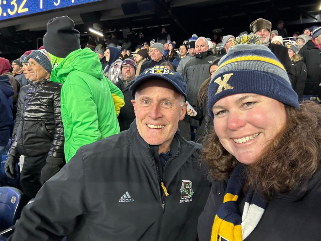 Meanwhile, Lauren sat by herself for a while trying to find familiar faces from the past … until the father of one of Grant’s old teammates called to her. She wound up sitting with several of Grant’s old buddies (one of them being a groom’s man at his wedding) and some of their parents. The has-beens predicted play calls based on formations, then yelled out their former coach’s favorite sayings and aphorisms. I was on airplane WiFi and Lauren sent me updates throughout. I stared at my phone, pulse pounding, while waiting for these, as though I had a kid involved. In the end, Xaverian prevailed in a classic, 31-25.