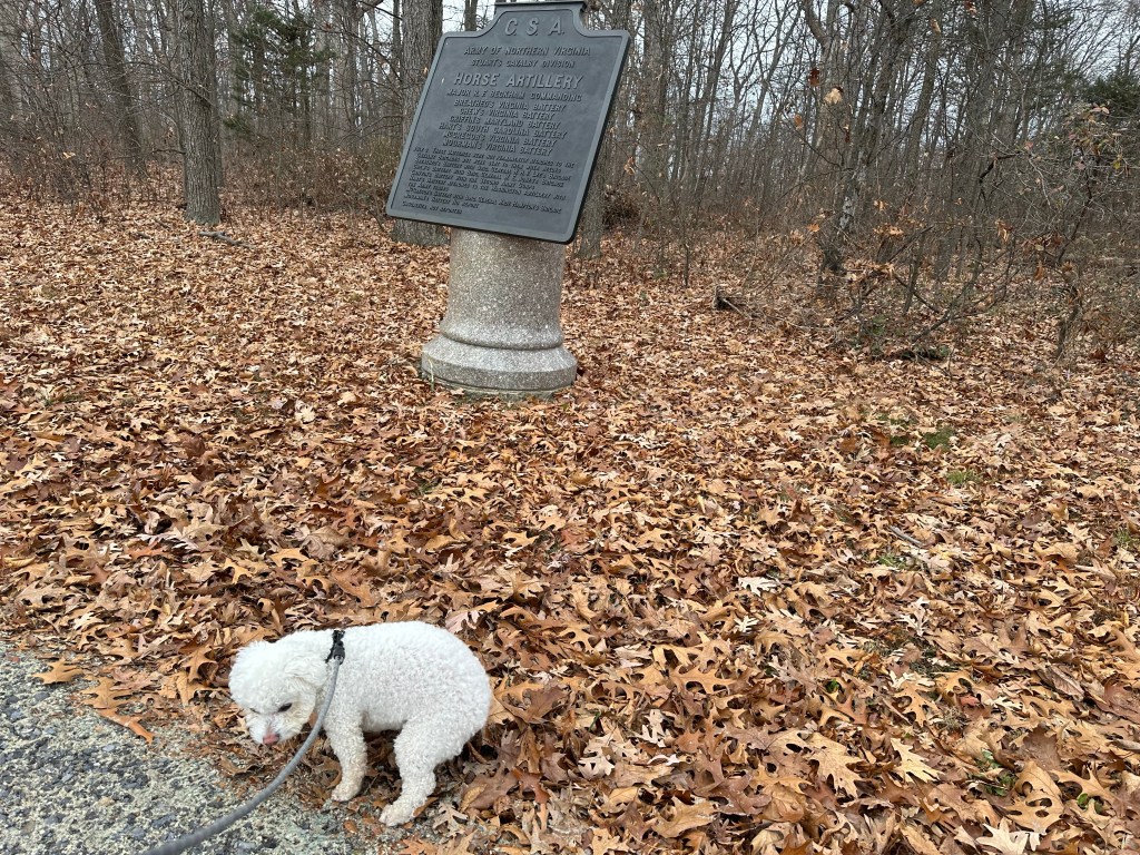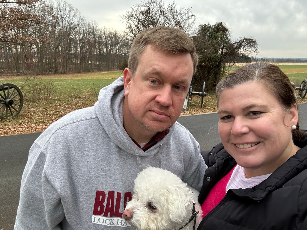 Today, Lindsay and Grant both had class, so Lauren and I took Dobby to Gettysburg. Of course, Gettysburg is a living, breathing past-as-present town. It was an ordinary American farm town until 120,000 men descended on it and clashed for three days; its place in history was etched when a certain president went to help dedicate a cemetery and deliver “a few appropriate remarks.” Growing up in Texas, I used to say to my mother that I wanted to visit Gettysburg and all the historical sites around Washington, DC, and my mom always said, “You’ve already seen all of them.” Cheeky response. I was born in McLean, Virginia, and my parents went to all those sites on weekends, bringing with them an infant me. But Mom’s enthusiasm to return wasn’t that high because, “Your father had to stop to read Every. Damn. Plaque. on every inch of the battlefield. In fact, just driving there, we would sometimes see a brown government sign on the road that said, ‘Historical Marker Next Right,’ and your father would take that turn and I would say, ‘What in hell are you doing?’ and he would say, ‘We have to see this marker. It’ll just be a minute.’ Now imagine there are five hundred markers and each is ‘just a minute.’”