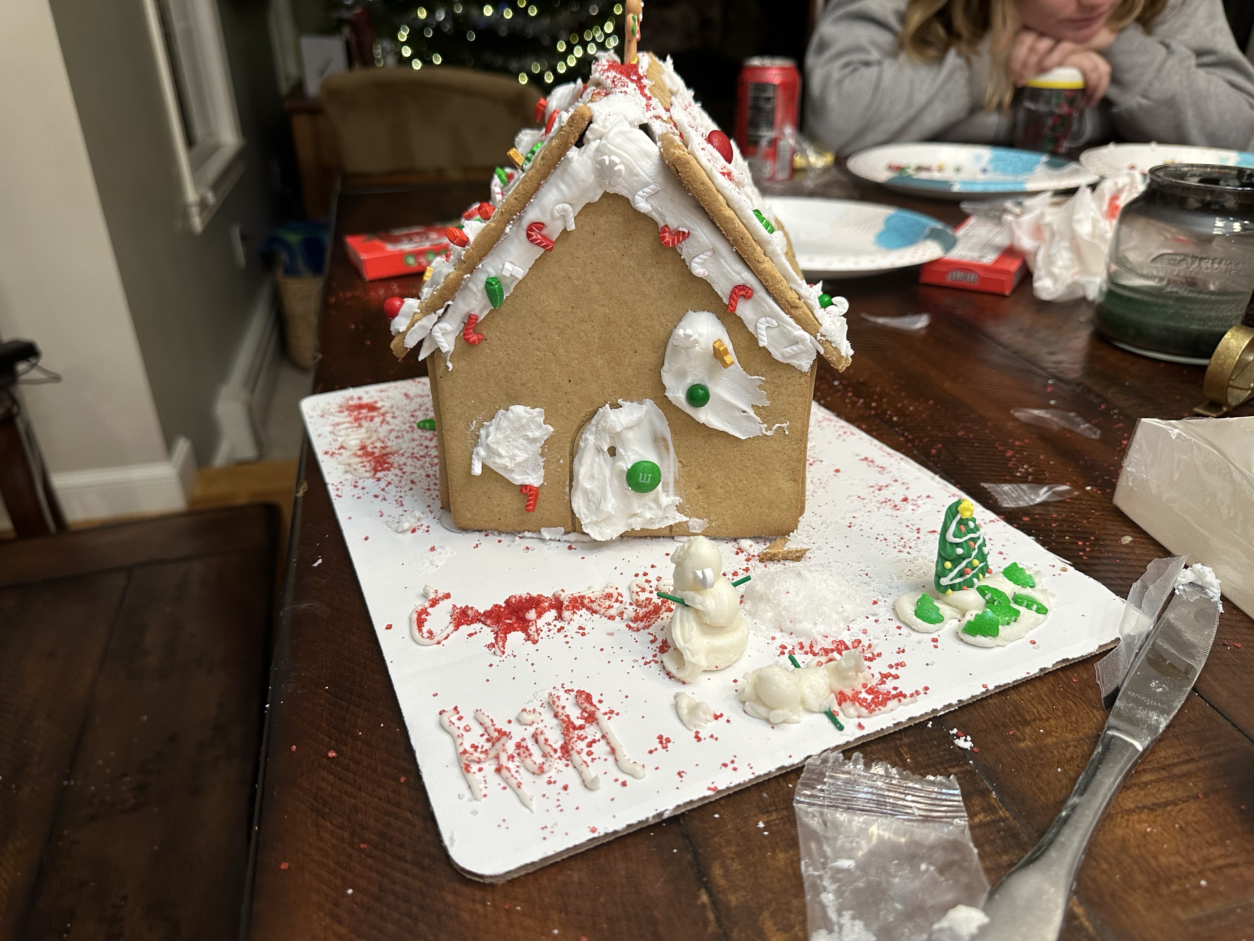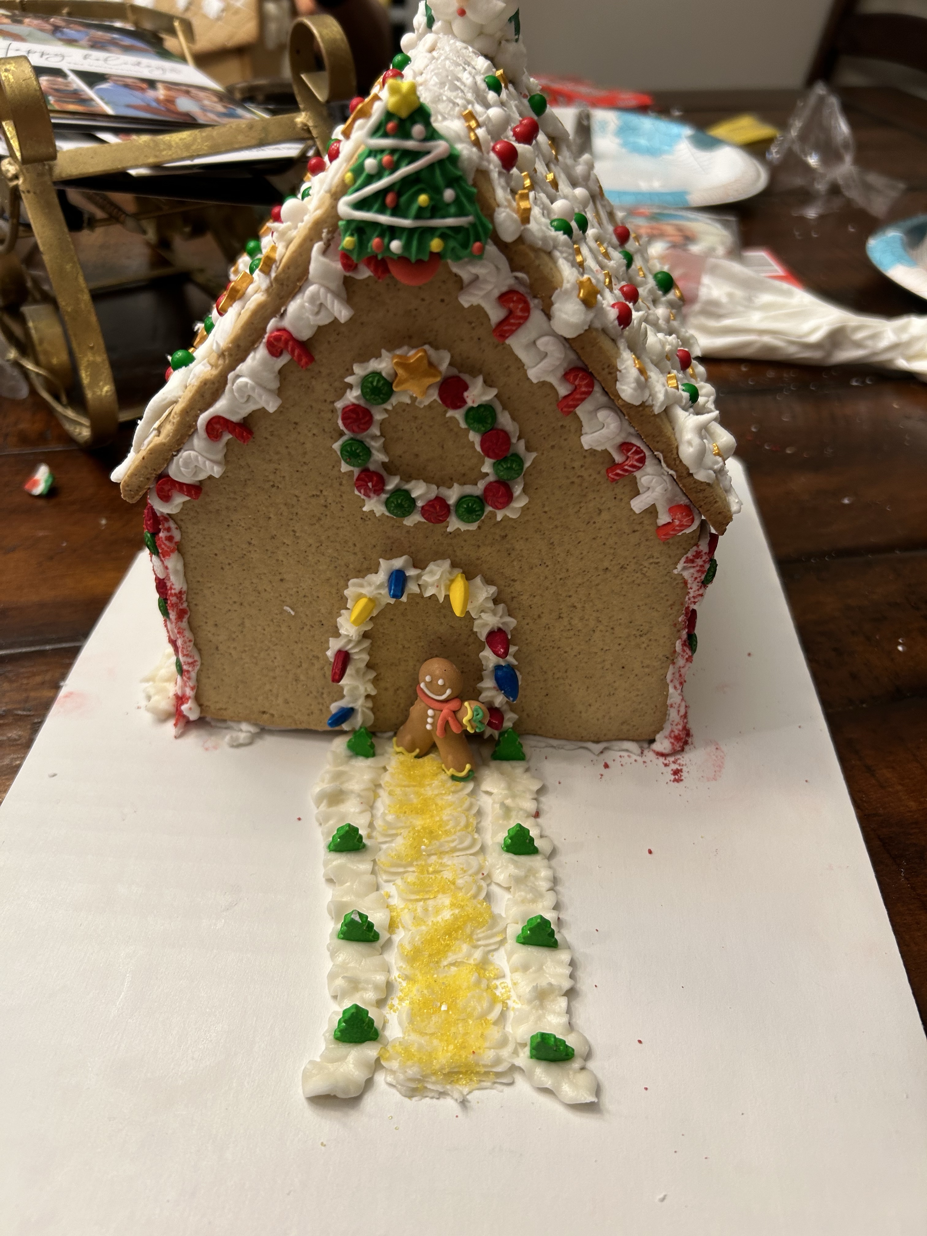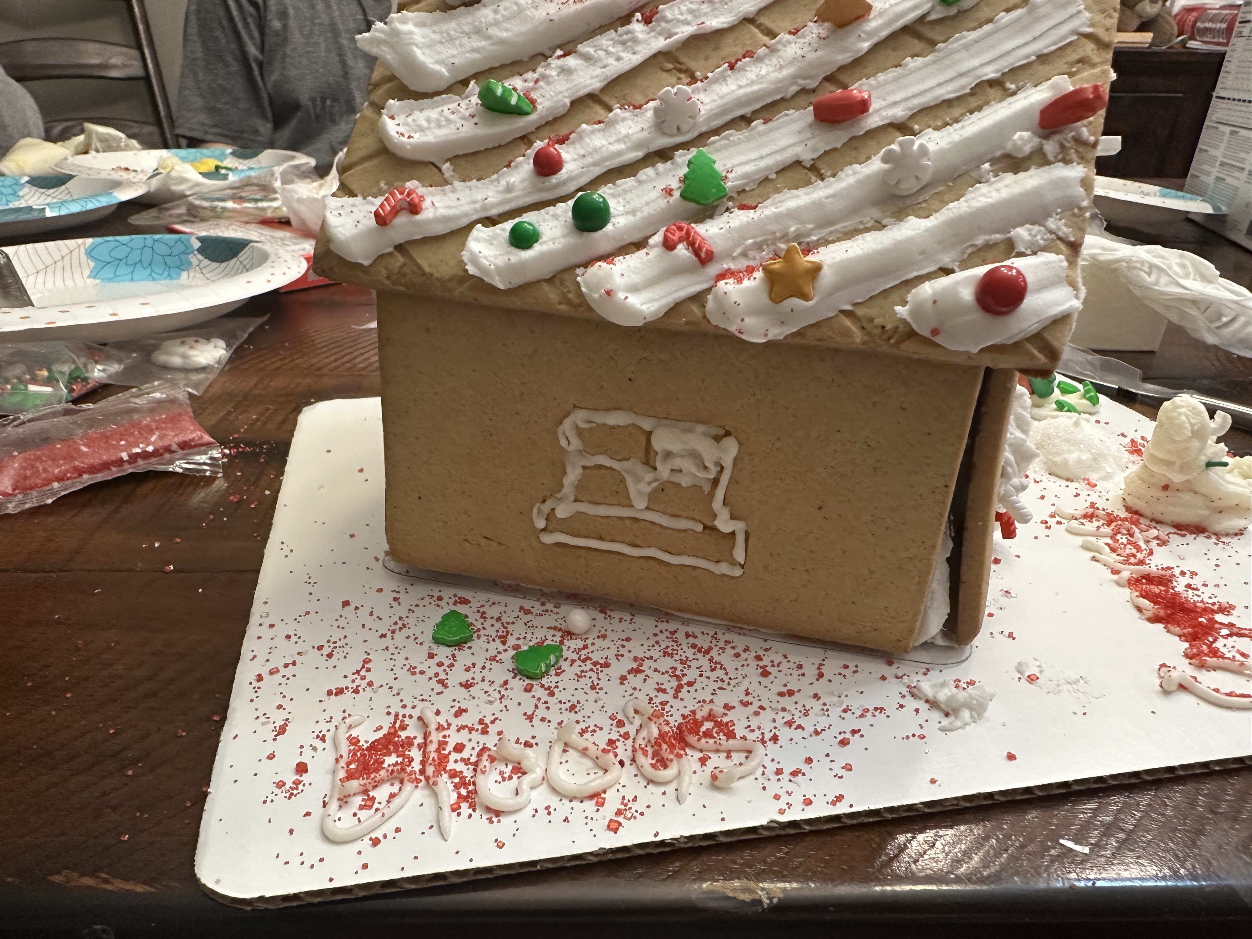 I laid a line of icing at the peak of the roof. “Put the gingerbread man there,” Graham said.