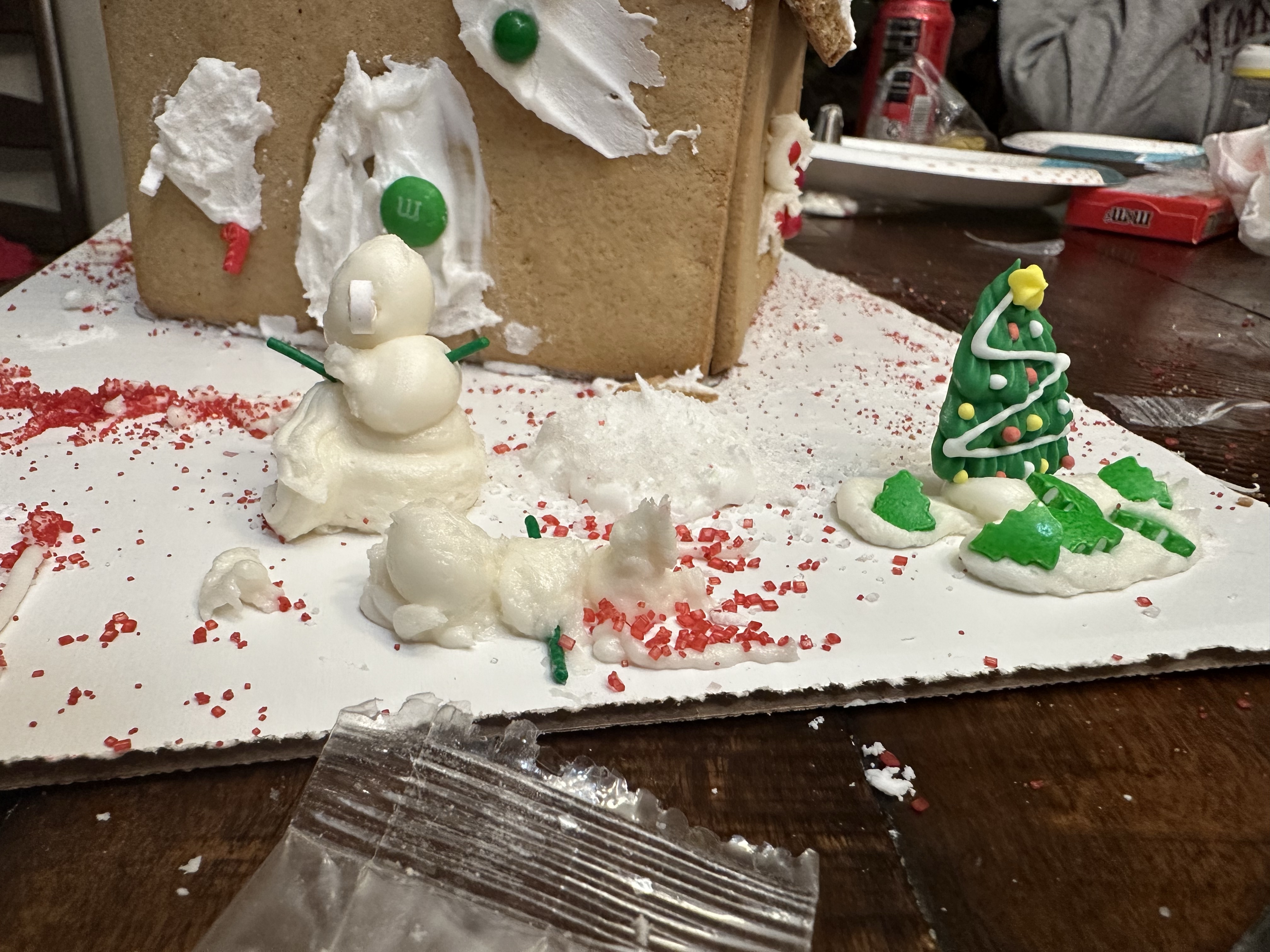 I put two huge globs of icing down, then poured all the rest of the white sugar crystals in one while Graham piled trees flat into the other.