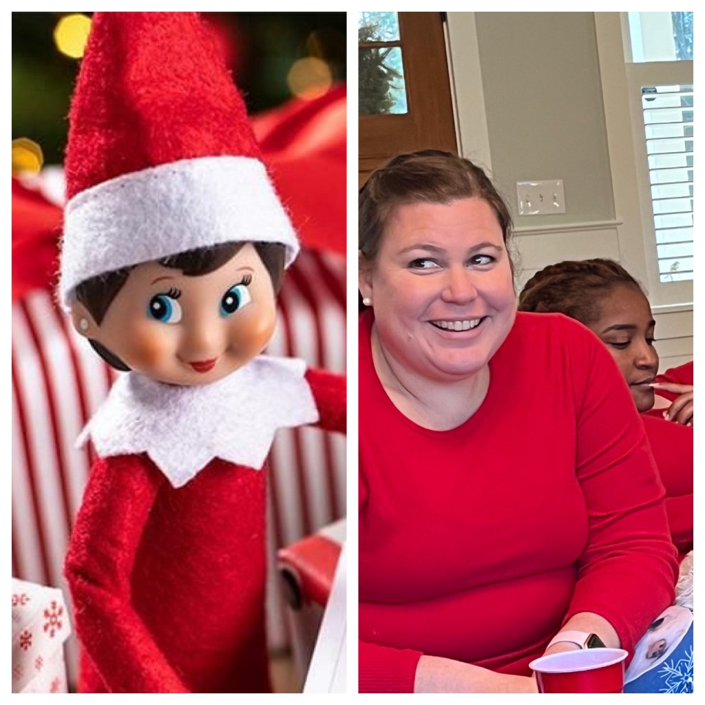 Those reactions may not stick as much as the following image. Lucia has a unique ability to capture candid images at weirdly awkward moments. We had Christmas brunch with friends, and Lucia extracted Lauren out of one group image. “Mom is the Elf on the Shelf!”