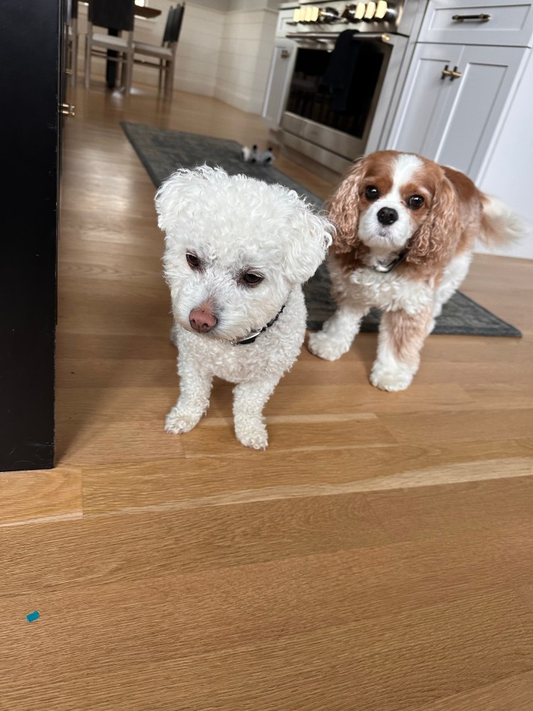 Last night, we arrived back from our quick trip to Florida and went to pick up Dobby from the Smiths’ house, our forever friends who watched Dobby while we were away. They have two King Charles Cavalier Spaniels, Bingley and Charlie (boy and a girl), and they are also fostering a mutt named Coco who is on the high energy side. Dobby met Coco when we had brunch with the Smiths on Christmas Day. After a few minutes, Dobby hid under a chair to ease all the attention from the dogs.