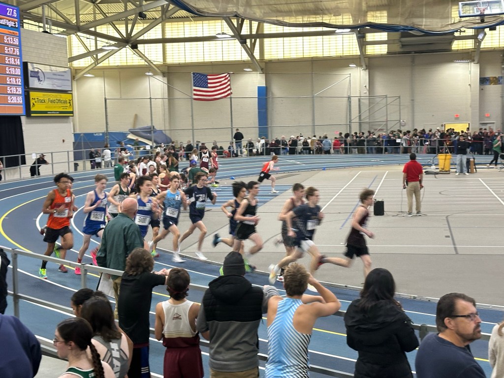 Graham had the statewide freshman/sophomore meet at the Reggie Lewis Center in Boston today. He was seeded eighteenth out of seventy-four in the mile, and he outperformed his seed, finishing sixteenth. He also set a new personal best at 5:01. The mile is run first, so we left shortly after he ran and went home to rest a bit while he stayed back with the team to cheer on his buddies. I took Dobby for a hike at some nearby conservation land and was happily looking for artifacts when Graham texted: We’re twenty minutes from the school and DJ needs a ride.