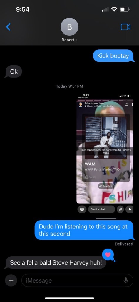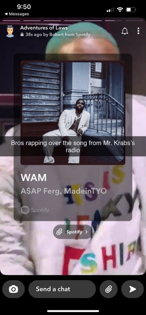 Then, she sent a snapshot from Graham’s Snap story. (Remember that I told you he likens new songs to Spongebob?)