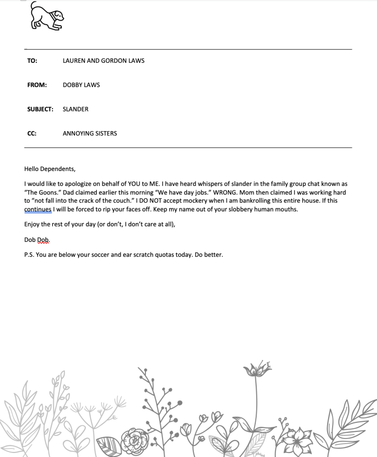 The next day, both Lindsay and Lucia sent menacing messages demanding pictures of Dobby immediately with dire consequences for failure to deliver. I pointed out to said demanding young that we have day jobs and don’t just sit around all day waiting for them to demand things. And well, that yielded another memo outburst from Dobby.