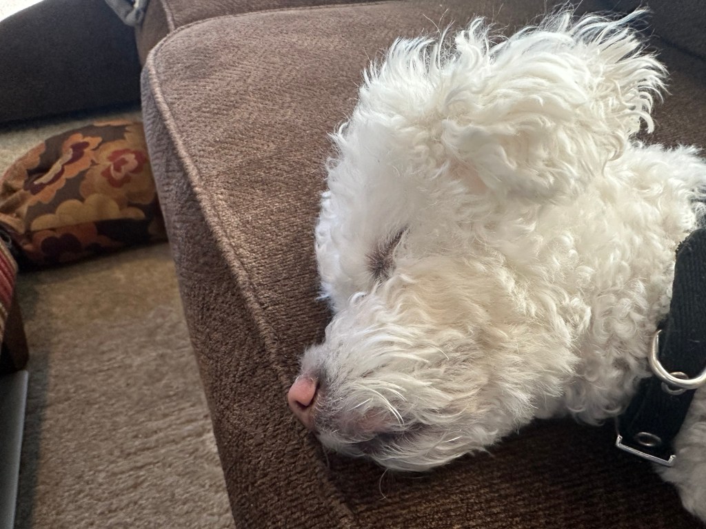 On Sunday mornings, I try to change up the routine by taking Dobby for a hike in the woods behind the house. I prefer this because I don’t have to clean up his poop, and I also don’t feel obligated to be going any pace—it’s mental and physical exercise for him but is a day off for me. The problem is that Dobby thinks every day should be his walk, and he does not approve of derivations of the routine. We even have a special hiking leash, and he knows the difference between hike and walk. I told him several times we were going for a hike. I put his hiking leash on, opened the door, and he flew out like a shot up the driveway. But I pulled back and redirected him toward the side of the house.