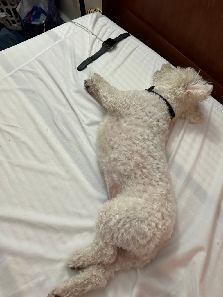 This morning, we got out of bed and stripped our sheets. Dobby, however, was not ready to roll, so Lauren snapped a photo of him and sent it to the Goons.