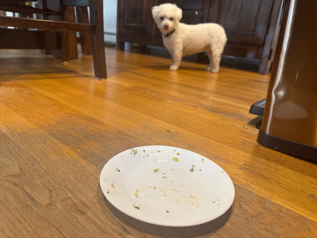 Lunch, though, was another story. We had plenty of leftovers, so I made a plate for me and one for Dobby. All was the same with one exception—I added ranch dressing to Dobby’s. The result?
