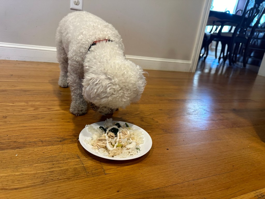 Speaking of Dobby and meals, we’re back to being tepid on chicken. I made him some delicious sautéed chicken thighs, zucchini, and spinach. Check out his enthusiasm level.