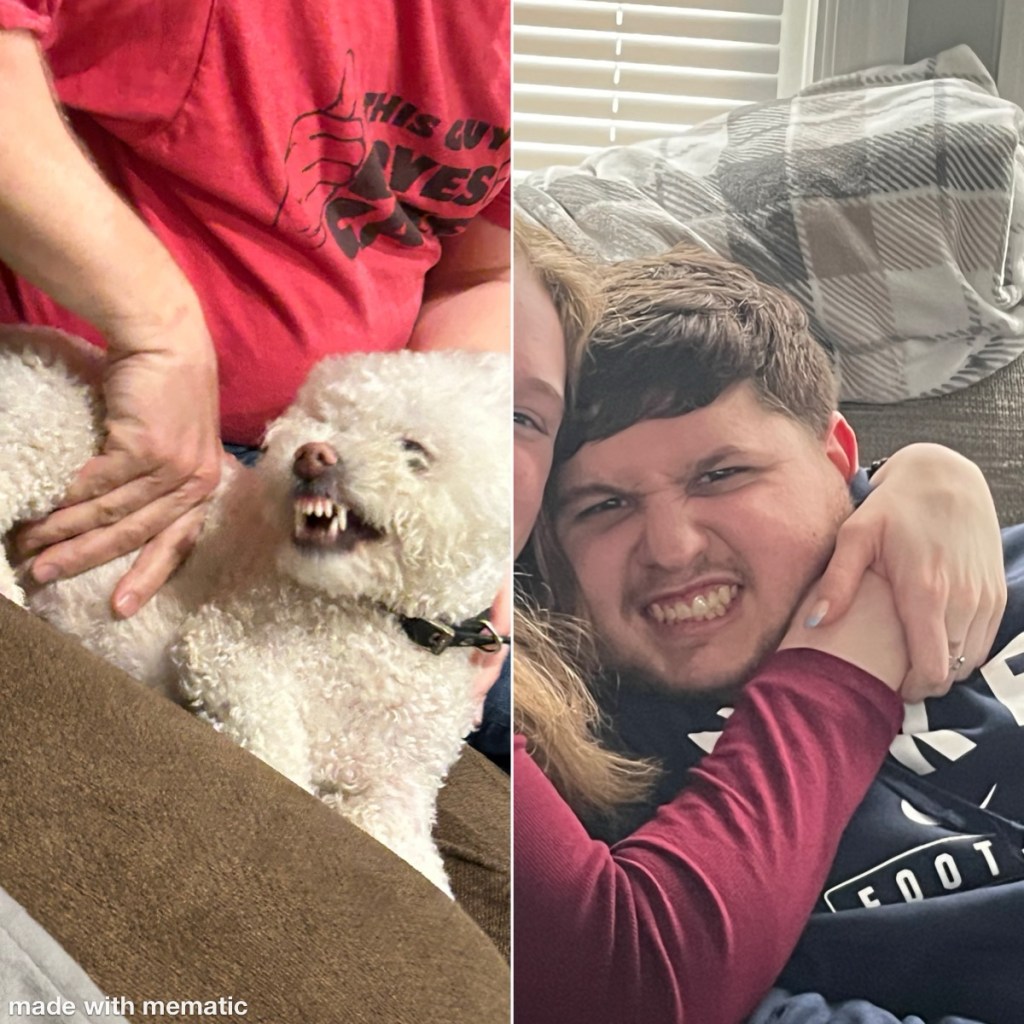 Why? Lauren had captured some photos of Dobby playing with me the other night, and one of those looked pretty ferocious. Carson is on a mission to be best friends with Dobby, and imitation is the highest form of flattery. So for clarity, here’s a comparison.