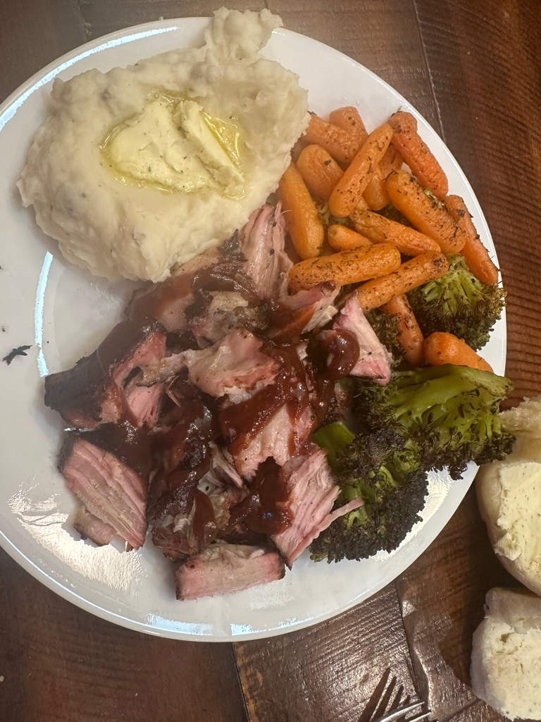 At Church, we did find three people who wanted to have Easter dinner with us. Fortunately, we had plenty of pulled pork. I mentioned yesterday how I made videos to show Grant how to smoke meat properly. I sent him a picture of finished product and said, “This is how it’s done.”