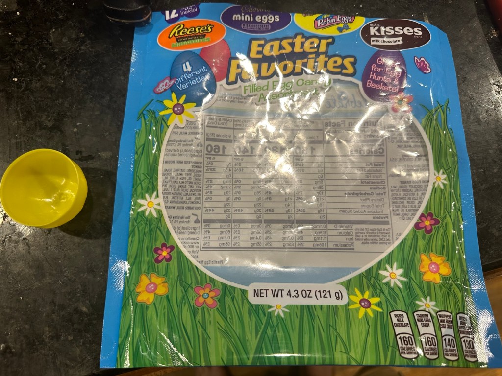 As Lauren was engaged doctoring the mindy mint, I was cracking open the package of pre-stuffed eggs. Yeah, we bought pre-stuffed eggs. We’ve never done this before, but we’re down to the final kid and we had open debate about whether there would even be an Easter egg hunt, but Lauren, pretending we believe in fairness, said we couldn’t abandon all tradition for the last child. We compromised by buying eggs that already had candy in them so as to minimize the effort.