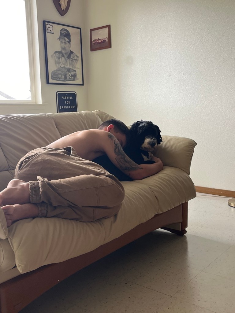 Brayden works nights, and Lu is doing a couple of extra credits of schooling to meet CPA thresholds. When she leaves for school in the morning, Bowie has to go into a crate because otherwise, he insists on Brayden playing with him and Brayden needs to sleep at least a few hours. Bowie is, however, a mama’s boy. When Brayden gets up and feels like cuddling, well, Bowie clearly takes an L as the picture shows.